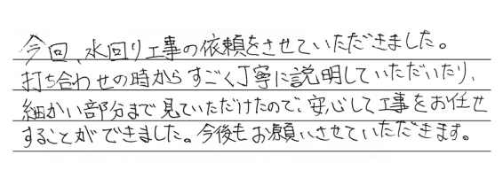 今回、水回り工事の依頼をさせていただきました。打ち合わせの時からすごく丁寧に説明していただいたり、細かい部分まで見ていただけたので、安心して工事をお任せすることができました。今後もお願いさせていただきます。