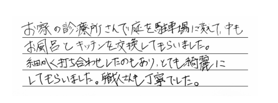 お家の診療所さんで、庭を駐車場に変えて、中もお風呂とキッチンを交換してもらいました。細かく打ち合わせしたのもあり、とても綺麗にしてもらいました。職人さんも丁寧でした。