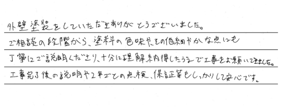 外壁塗装をしていただきありがとうございました。ご相談の段階から、塗料の色味やその他細かな点も丁寧にご説明いただき、十分に理解・納得したうえで工事をお願いできました。工事完了後の説明やアフター保証等もしっかりしており安心です。