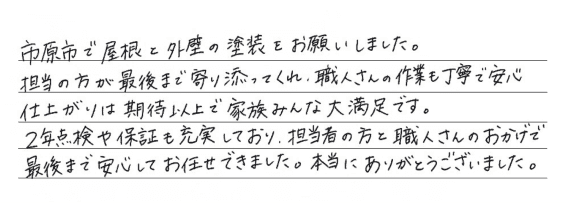 市原市で屋根と外壁の塗装をお願いしました。担当の方が最後まで寄り添ってくれ、職人さんの作業も丁寧で安心仕上がりは期待以上で家族みんな大満足です。2年点検や保証も充実しており、担当者の方と職人さんのおかげで最後まで安心してお任せできました。本当にありがとうございました。
